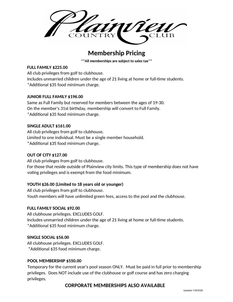 Plainview Country Club offers a variety of membership options that will be sure to fit your individual or family’s lifestyle.